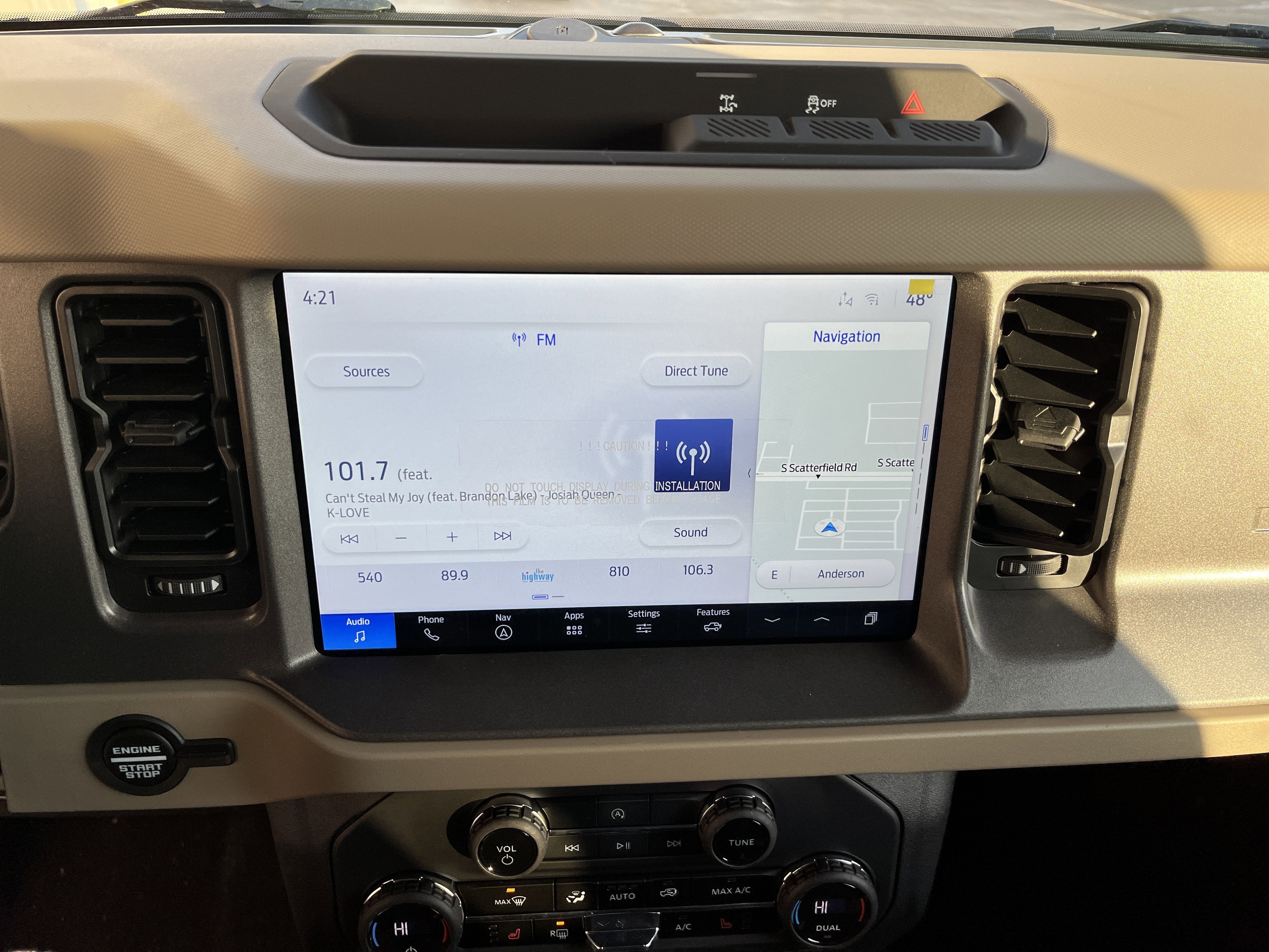 - EQUIPMENT GROUP 222A MID PACKAGE -inc: Rear Parking Sensors Power Outlet - Back Side of Center Floor Console Dual Smart Charging USB Ports Front Row Heated Seats Dr & Pass Illuminated Sliding Visor Vanity Mirrors Dual-Zone Electronic Automatic Temperature Control air conditioning Ford Co-Pilot360 Enables compatibility w/FordPass performance app w/off-road navigation Auto High-Beam Headlamps Pre-Collision Assist w/Automatic Emergency Braking pedestrian detection forward collision warning and dynamic brake support Blind Spot Information System (BLIS) Cross-Traffic Alert Rear View Camera backup assist grid lines Lane-Keeping System Lane-Keeping Alert Lane-Keeping Aid and Driver Alert Connected Navigation 1-year subscription pinch-to-zoom capability live traffic predictive destinations and route guidance and One Box search Navigation services require SYNC4 and FordPass Connect complimentary connect service and the FordPass app (see FordPass terms for details) Cu